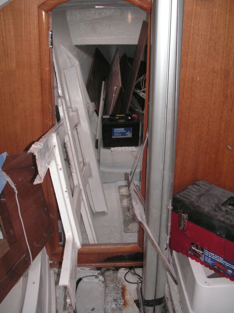 The ballast tanks will each hold 290 litres of seawater. The plywood MUST be PERFECTLY waterproof. Epoxy resin is the man for the job. Here the bulkheads and inserts are on the workshop table, sanded, dusted, cleaned with acetone. The table is covered with newspaper, but also several large sheets of acetate (from a friend’s printworks). Epoxy will not stick to the acetate, meaning we don’t have to worry about drips or overflow 0r the newspaper stuck to the underside after coating.